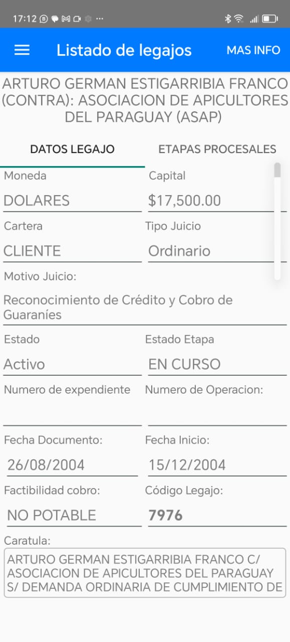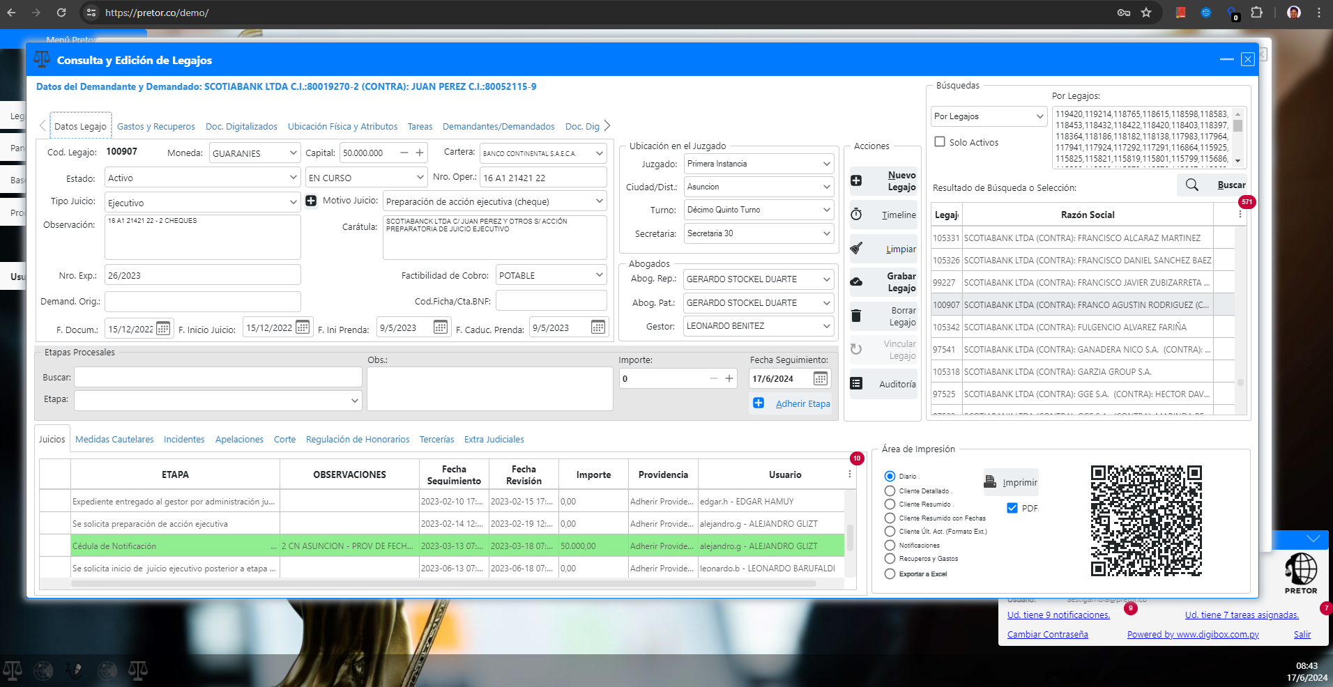 El formulario de entrada y edición de legajos, presenta la información de manera organizada como para visualizar mucha información de un vistazo. Por ejemplo, al seleccionar la Secretaría 2 del Tercer Turno del Distrito Villamorra del Juzgado de Paz, con filtros aplicados para un gestor/abogado/procurador dado y en el estado activo, incluyendo legajos con Sentencia y excluyendo recuperos, el sistema muestra de forma eficiente los datos pertinentes, reflejando la precisión y el control que Pretor CMS aporta a la gestión de casos.