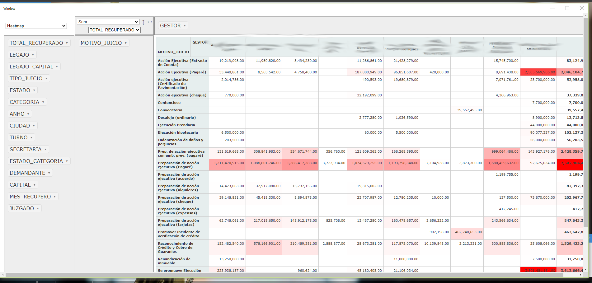 Cada tono representa una historia de éxito, mostrando quién recuperó más, basado en cheques extraídos y el estado de los casos. Como un cubo mágico, este reporte se adapta a tus deseos, permitiéndote manipular las etiquetas y transformar la visualización en una danza de información. Cada clic te invita a explorar más, a descubrir patrones y secretos escondidos en los datos. Este es solo un ejemplo de cómo Pretor CMS convierte el análisis de datos en una experiencia casi mágica, invitándote a interactuar y moldear la información a tu gusto